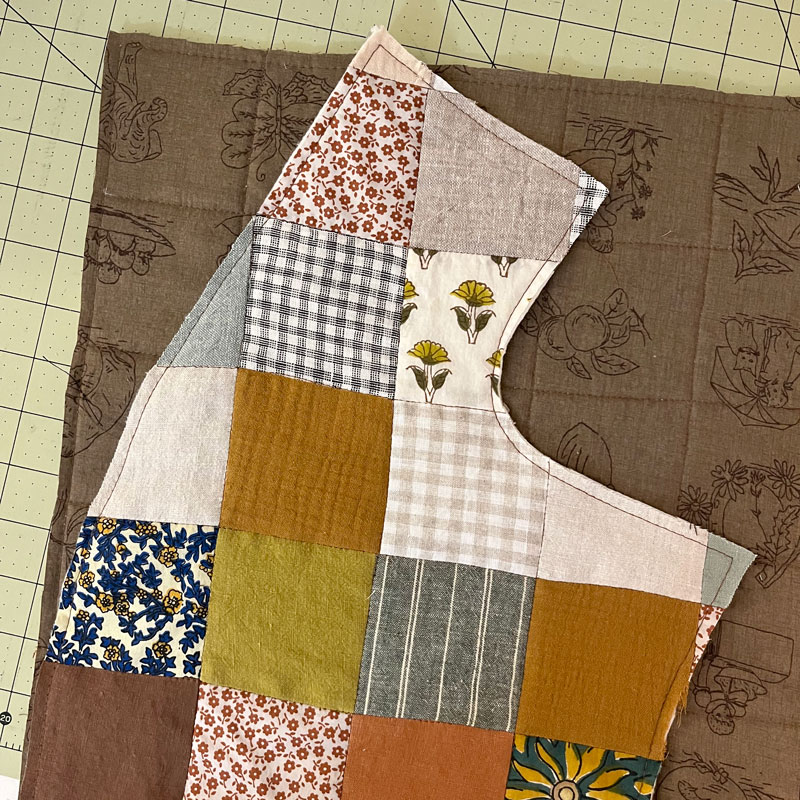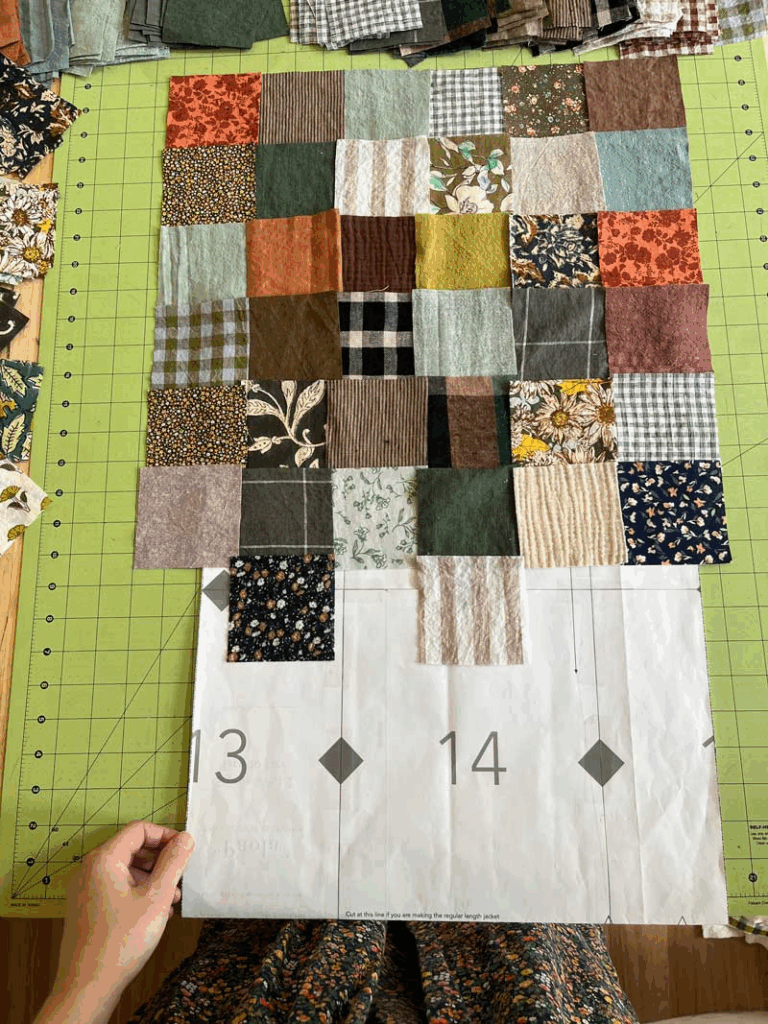 Standard square size: Cut 3.25″ squares that finish at 2.75″ after sewing with 1/4″ seams. For a medium jacket, you’ll need approximately 366 squares total—70 squares for each front piece (×2), 60 for each sleeve (×2), and 106 for the back.