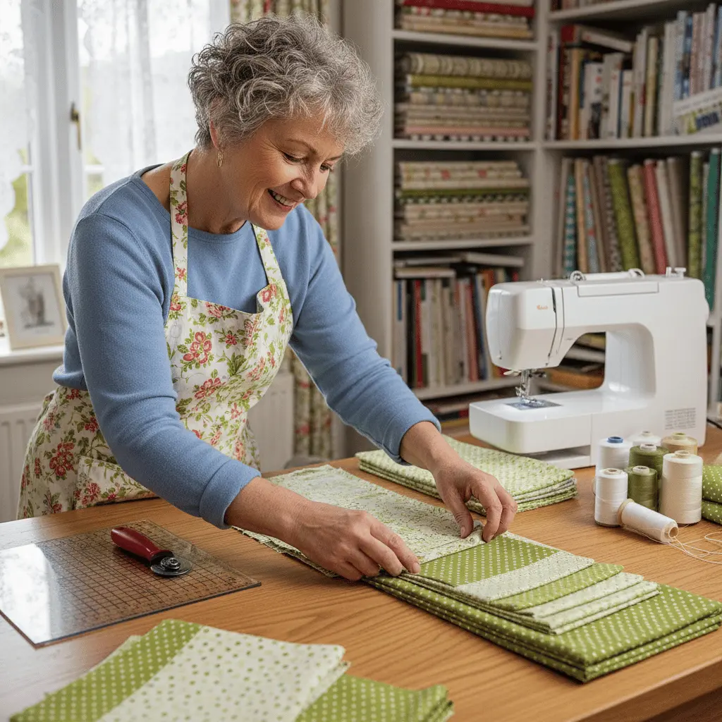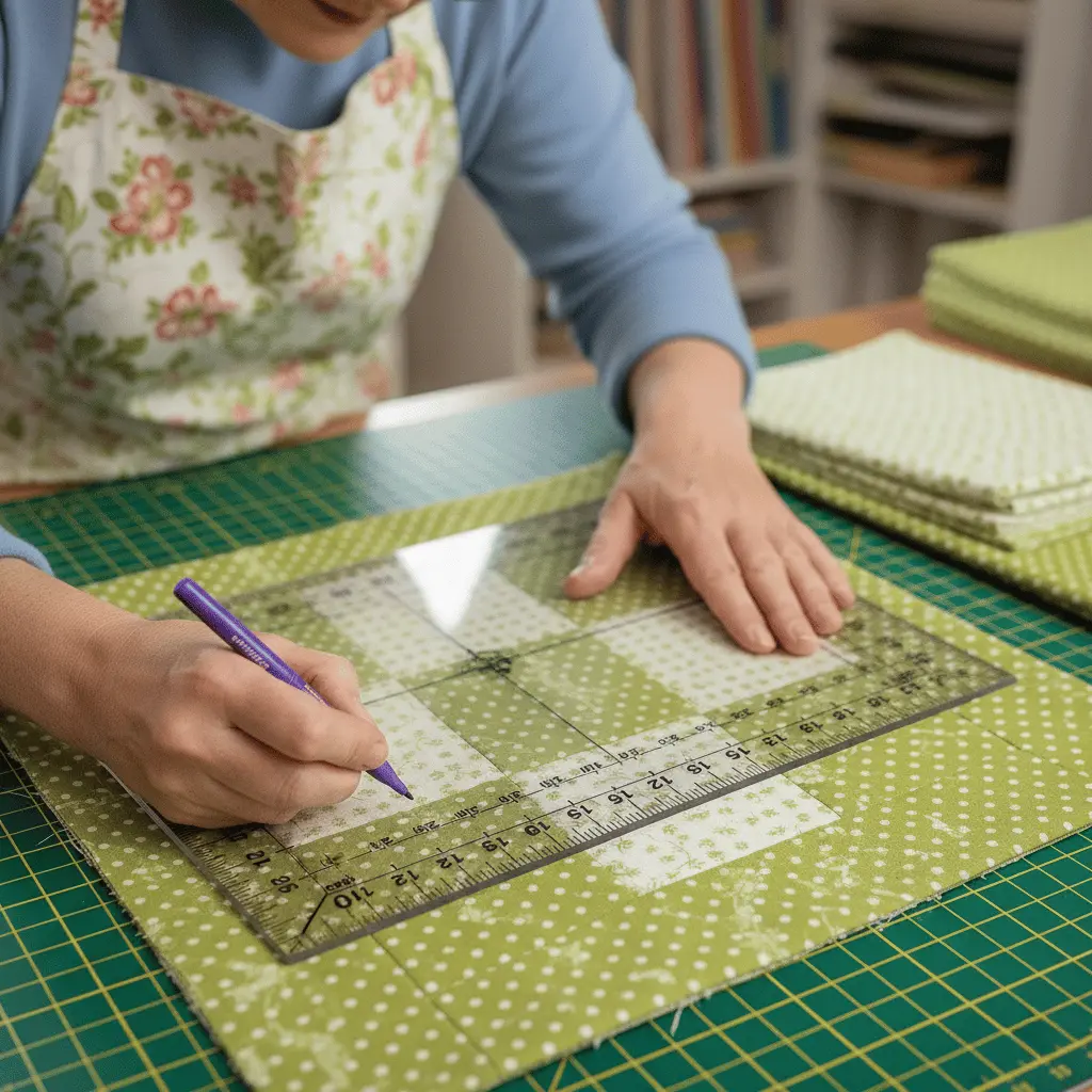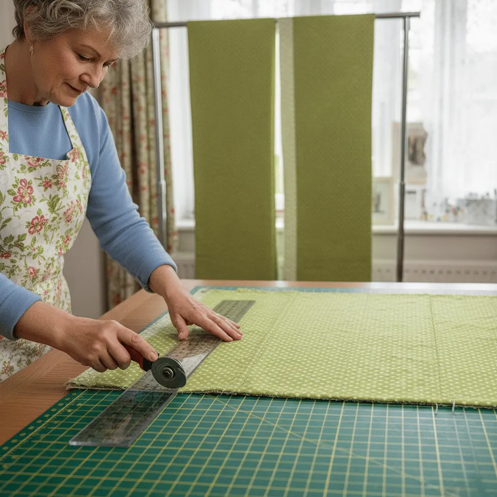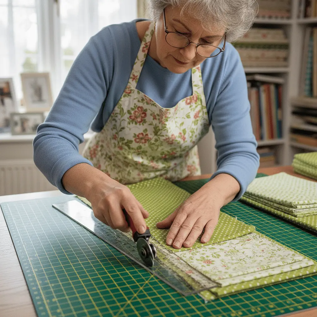 Cutting Technique: Layer fabric in 4-6 layers. Use rotary cutter with firm, even pressure. Cut strips first (5.5″ wide), then sub-cut into 5.5″ squares. Stack cut squares by color.