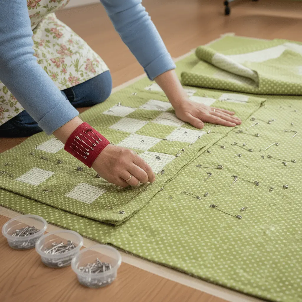 Working from the center outward, secure all three layers together. Place curved safety pins every 4-6 inches across the entire quilt surface, avoiding areas where you’ll quilt. Alternatively, spray baste layers for a smoother surface.