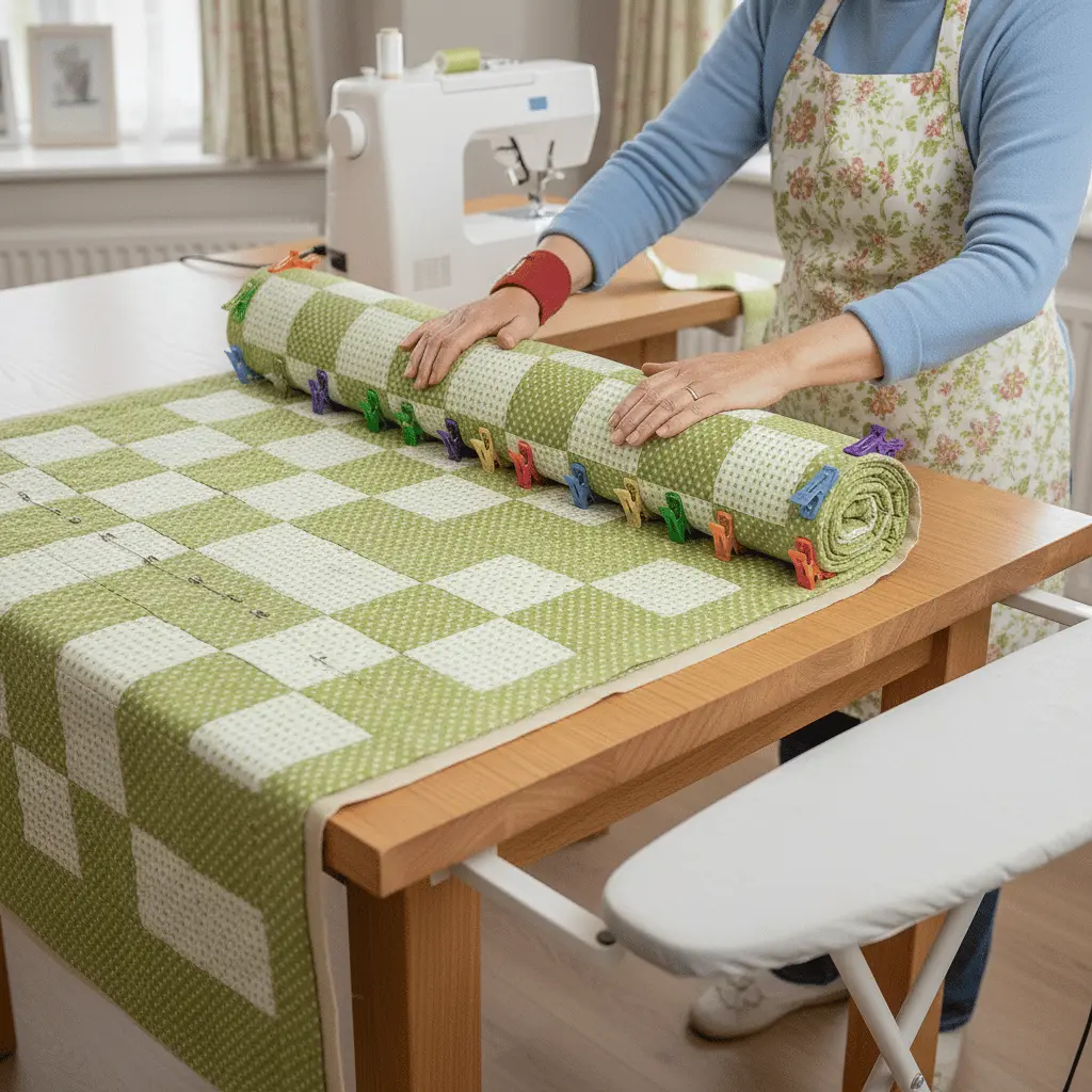 • Spray basting: Use temporary adhesive spray between layers (faster, less bulk)